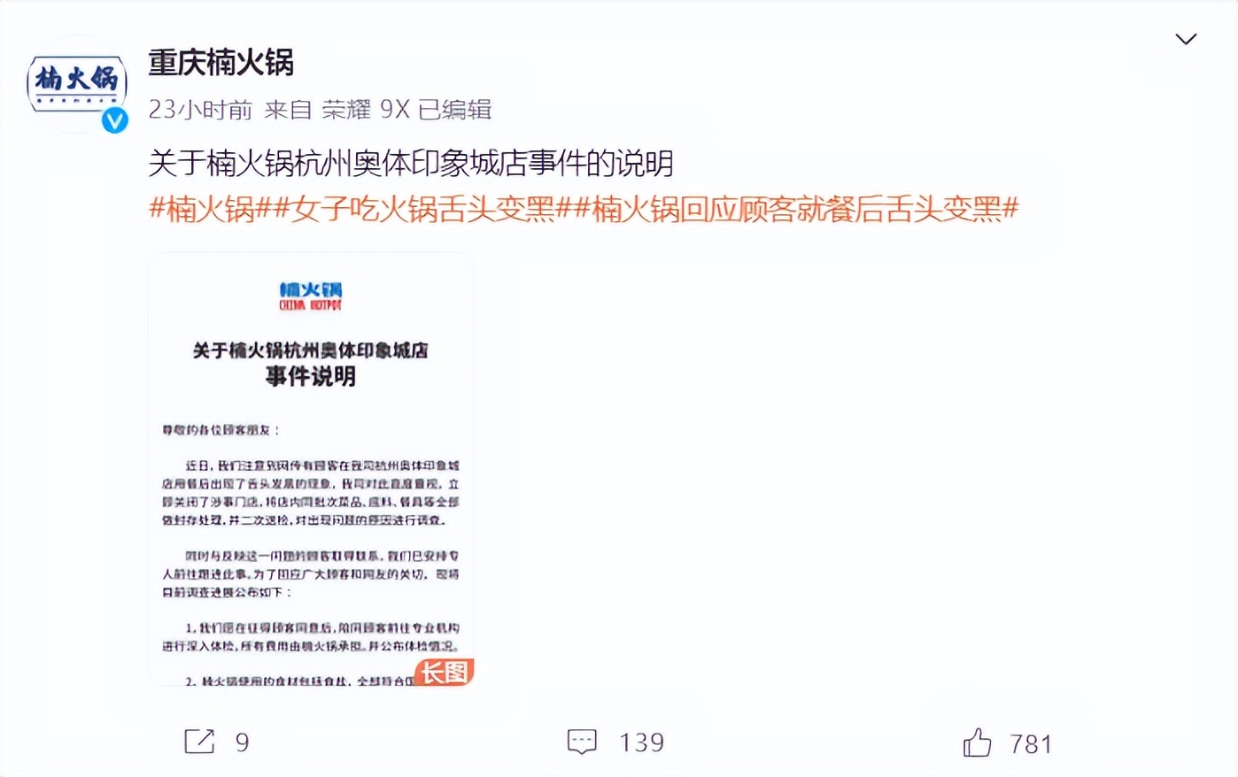 對于楠火鍋的回復(fù),有網(wǎng)友認為應(yīng)該和鐵鍋無關(guān),也有網(wǎng)友懷疑是亞硝酸鹽導(dǎo)致的。6月17日,楠火鍋發(fā)布了事件說明,否認了網(wǎng)友亞硝酸鹽、循環(huán)使用鍋底的猜測,表示“楠火鍋使用的食材全部符合國家標準,決不存在網(wǎng)傳的亞硝酸鹽等食品安全問題”。同時,承諾“所有門店使用的湯底均為一次性食用”。至于導(dǎo)致舌頭變黑的原因,還需要等專業(yè)機構(gòu)的檢測結(jié)果。