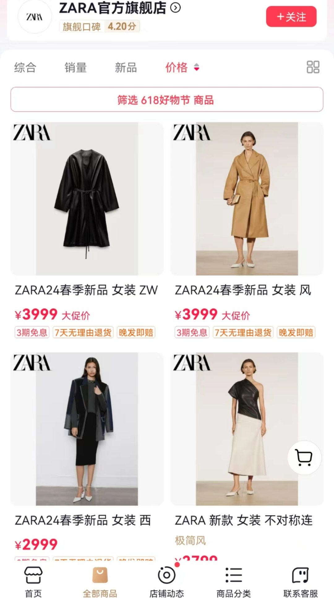高端,就代表著貴,在抖音的ZARA官方旗艦店中,多款大衣、風衣、西裝價格在2000元以上,最貴的一件大衣外套價格為3999元,很難讓人聯(lián)想到曾主打性價比的ZARA。