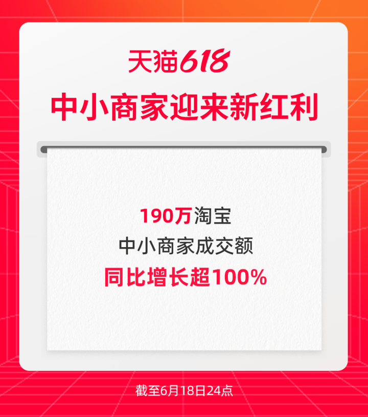 截至6月18日24點,今年天貓618有190多萬中小商家成交額同比增長超100%,近3萬中小商家成交破百萬,超過22萬開店一年以內(nèi)的新商家在618首秀即實現(xiàn)交易額破萬的“小目標”。