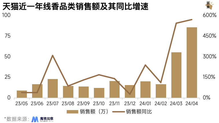 天貓近一年線香品類銷售額及其同比增速