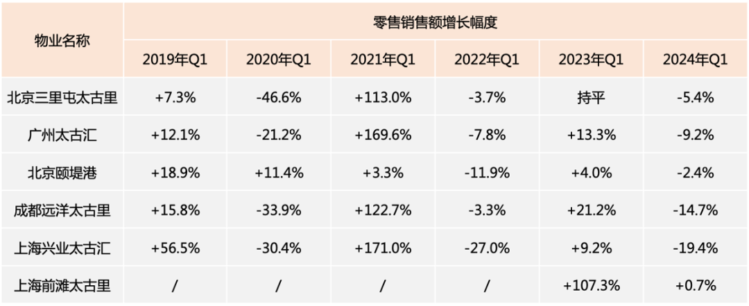 只是,保持時髦在今天并不容易,整體定位的變遷也需要時間。2024年第一季度,三里屯太古里的零售銷售額下滑5.4%,廣州太古匯、北京頤堤港、成都太古里、上海興業(yè)太古匯都出現(xiàn)不同程度的下滑,與去年同期的增長形成鮮明對比,有的降幅甚至超過受疫情影響嚴重的2022年同期,而它們所屬的太古地產(chǎn)一直被業(yè)界視為標桿。