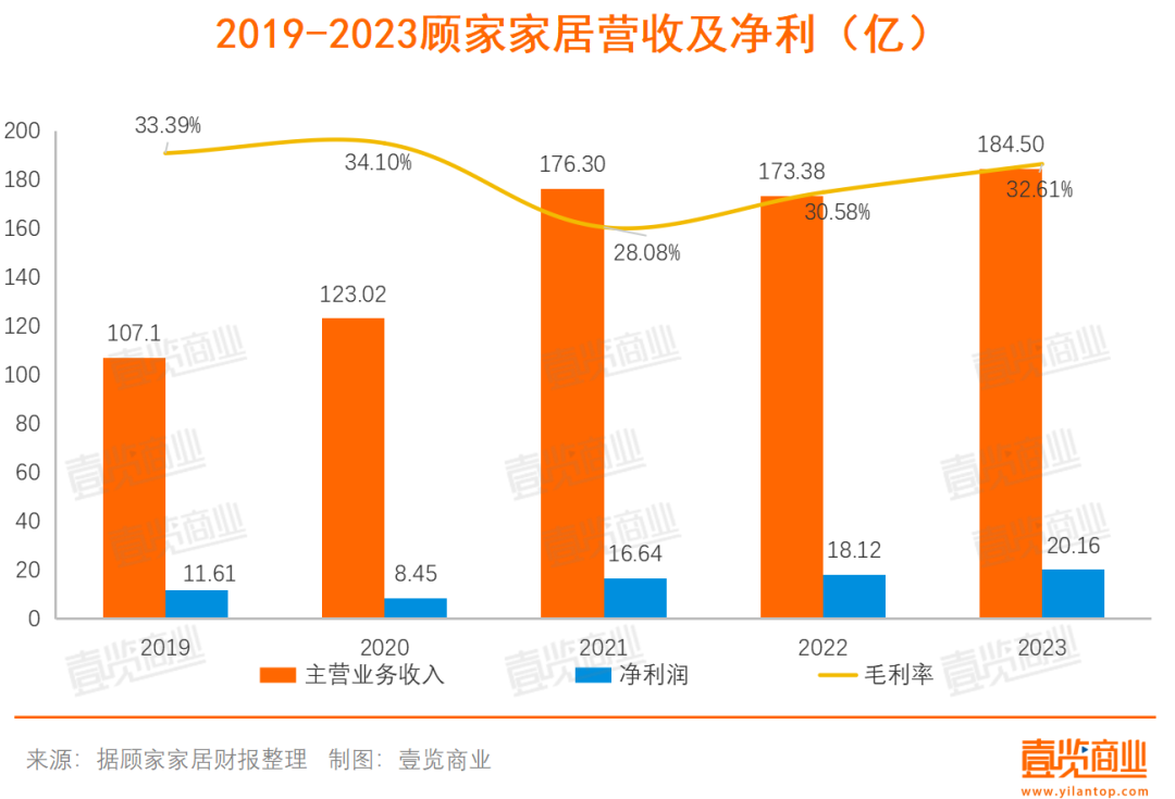 壹覽商業(yè)梳理顧家家居近五年?duì)I收數(shù)據(jù)發(fā)現(xiàn),一方面,顧家家居盈利能力依然穩(wěn)健,凈利潤(rùn)逐年遞增。另一方面,其整體營(yíng)收規(guī)模在2021年后增速開始放緩,毛利率也從2019年的33.39%降到2021年的28.08%,至今也未能漲回五年前的水平。