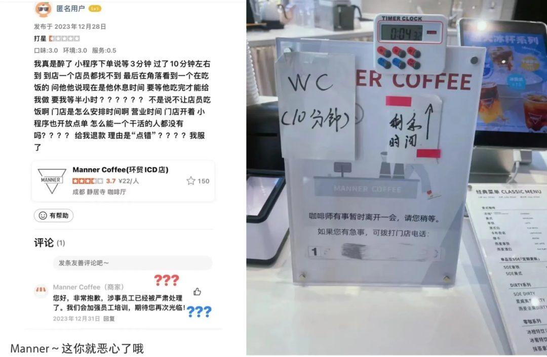 公司管理在公告中承諾將通過加強(qiáng)培訓(xùn)、優(yōu)化運(yùn)營和關(guān)懷員工三個方向進(jìn)行整改,但Manner似乎只看到了「員工頻繁情緒失控」,并未意識到問題出在了哪里。