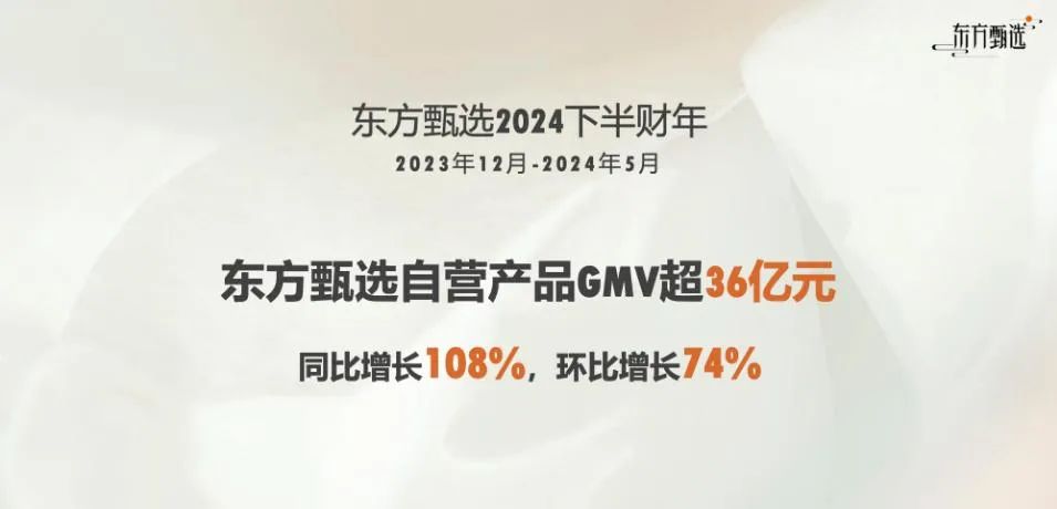 6月20日,東方甄選舉辦了自營(yíng)新品發(fā)布會(huì),并在會(huì)上首次公開(kāi)了自營(yíng)品的數(shù)據(jù)表現(xiàn):2024下半財(cái)年,即從2023年12月至2024年5月期間,東方甄選的自營(yíng)產(chǎn)品GMV(商品交易總額)已突破36億元,同比增長(zhǎng)108%。