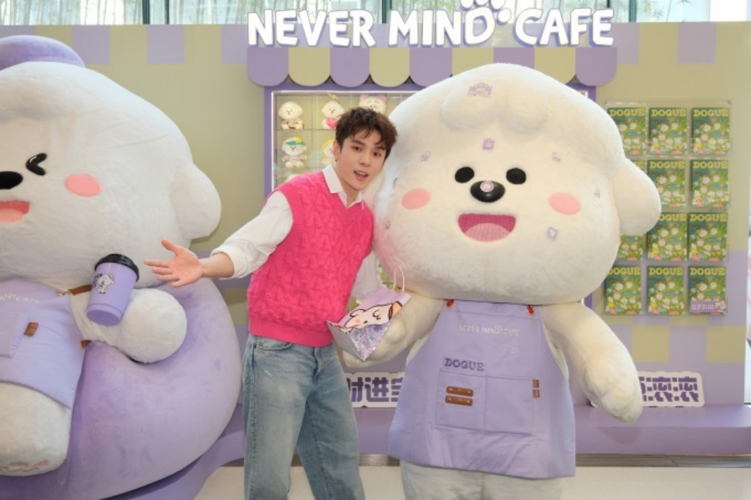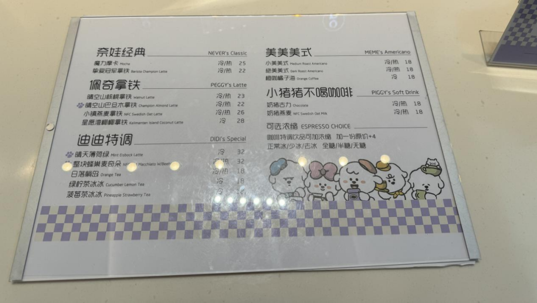 咖啡店整體呈紫色調(diào),根據(jù)IP情節(jié)設(shè)定,小奈咖由這五只生活在晴天小鎮(zhèn)的狗狗共同經(jīng)營。門店隨處可見奈娃家族元素,咖啡杯、紙巾、杯托、紙袋等物件均為特別定制,設(shè)專門的周邊展示區(qū)和拍照打卡點(diǎn)。
