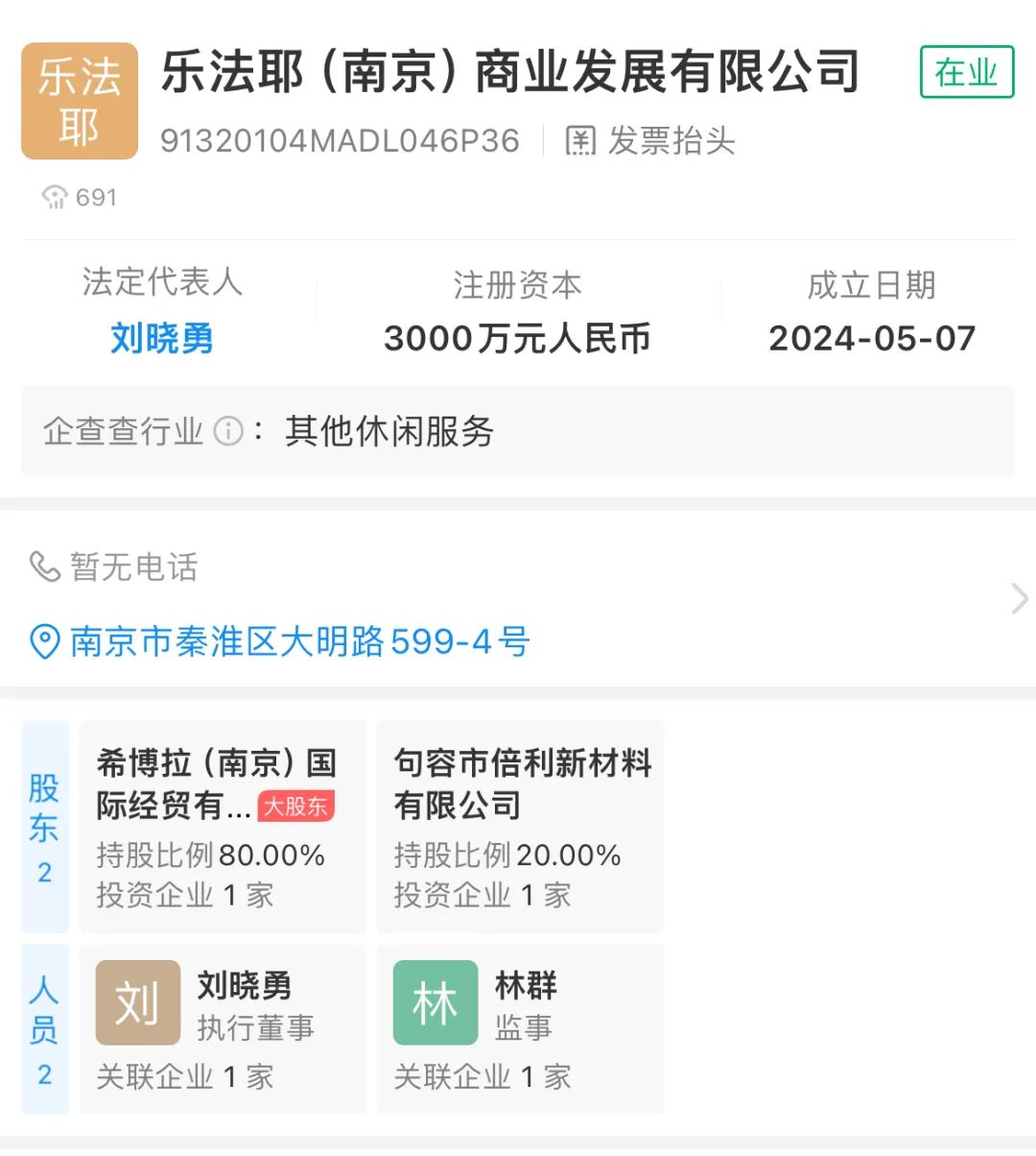 據(jù)企查查顯示,樂法耶(南京)商業(yè)發(fā)展有限公司成立于今年5月7日,注冊資本為3000萬元,注冊地址為南京市秦淮區(qū)大明路599-4號,公司經(jīng)營范圍包括保稅物流中心經(jīng)營、房地產(chǎn)開發(fā)經(jīng)營、免稅商品銷售等,公司股東分別是希博拉(南京)國際經(jīng)貿(mào)有限公司(持股80%)和句容市倍利新材料有限公司(持股20%)。