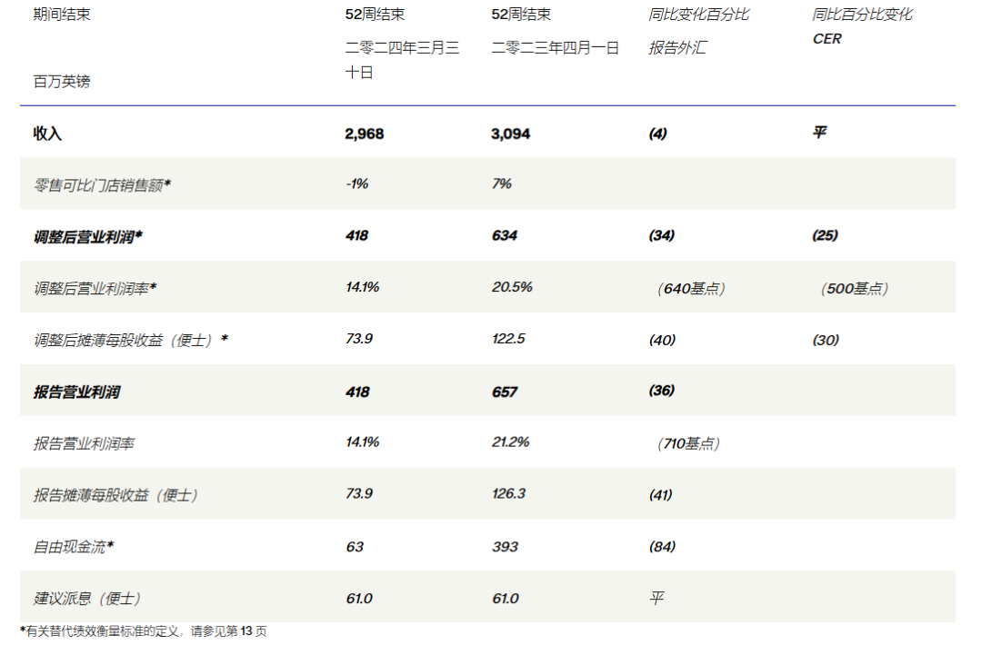 在天貓平臺上頻頻打折促銷的巴寶莉不僅未能拉動業(yè)績增長,反而還在反噬業(yè)績。2023年Q4,其在中國大陸整體銷售額較2022年同期下降12%,整個2024財(cái)年巴寶莉營收下滑4%。調(diào)整后營業(yè)利潤環(huán)比下降25%。