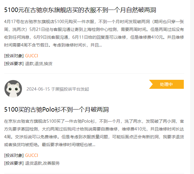 在線上平臺,GUCCI購買的衣服出現(xiàn)損壞,要求GUCCI退貨退款,GUCCI卻無法滿足客戶需求。在近些年來的媒體報(bào)道中,GUCCI先后被曝女子在GUCCI品牌店試衣服被店員辱罵;消費(fèi)者花費(fèi)8500元買的老爹鞋,剛穿一周就開膠了,店員卻稱“這不是質(zhì)量問題”等事件。