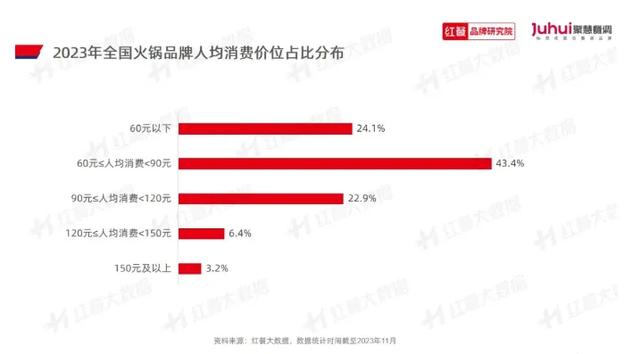 《火鍋品類發(fā)展報告2023》顯示,2023年時,60—90元已經(jīng)是火鍋店的主流價位,市場占比超43%。