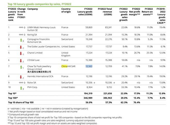 德勤發(fā)布的2023年奢侈品公司報(bào)告里,周大福憑借銷售額的領(lǐng)先,力壓愛馬仕和勞力士,登上全球奢侈品第七。