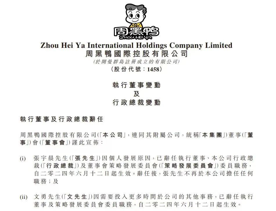 6月12日周黑鴨發(fā)布了一系列人事變動(dòng)公告,張宇晨因個(gè)人發(fā)展原因,已辭任執(zhí)行董事、公司行政總裁級(jí)董事會(huì)策略發(fā)展委員會(huì)委員職務(wù)。