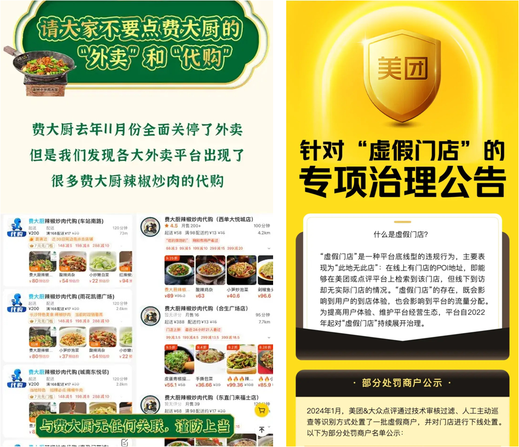 此外,外賣平臺上還涌現(xiàn)出很多知名餐飲品牌的代購店,也全是虛假門店。湘菜品牌“費大廚”曾因此在社交媒體上喊話,讓消費者不要購買此類外賣,其銷售的產(chǎn)品與費大廚均無關(guān)聯(lián)。