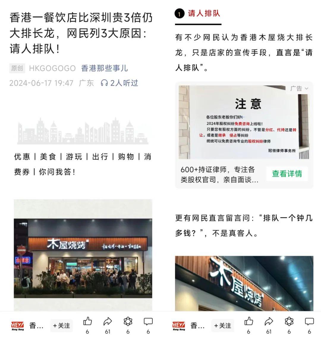 值得一提的是,在其“大本營”深圳,木屋燒烤的人均消費價格在70-105元左右;而據(jù)自媒體“香港那些事兒”報道,木屋燒烤的價格就比深圳的貴約3倍。即使這樣,木屋燒烤香港旺角店門口仍總是排滿等位的食客;對此,還有網民質疑其是店家的宣傳手段,直言是“請人排隊”。