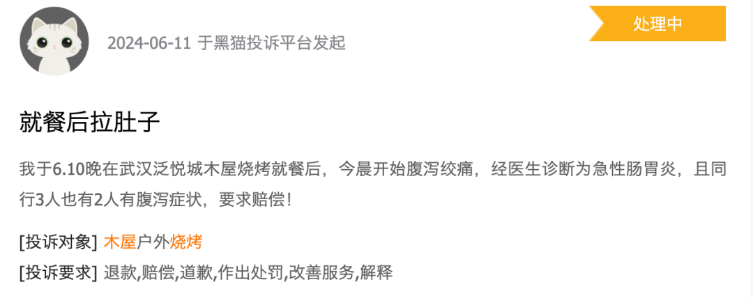 此外,自今年以來,在“黑貓投訴”平臺上也有消費者對木屋燒烤的食品安全問題進行指控。有消費者表示,“我于6.10晚在武漢泛悅城木屋燒烤就餐后,今晨開始腹瀉絞痛,經醫(yī)生診斷為急性腸胃炎,且同行3人也有2人有腹瀉癥狀,要求賠償!”