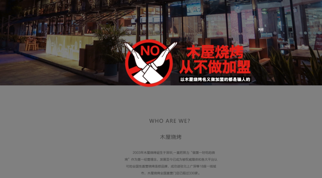 在木屋燒烤發(fā)展的過程中,隋政軍也確實在用這個標準要求公司。在木屋燒烤的官網,以及官微置頂中,都在強調“木屋燒烤從不做加盟,所有門店均為直營”。