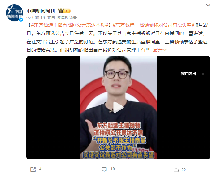 有觀點認為,從“小作文”事件到俞敏洪、董宇輝的無心之言,再到頓頓的“抱怨”,暴露了東方甄選過于依賴某一位主播和業(yè)務,以及背后的管理問題。