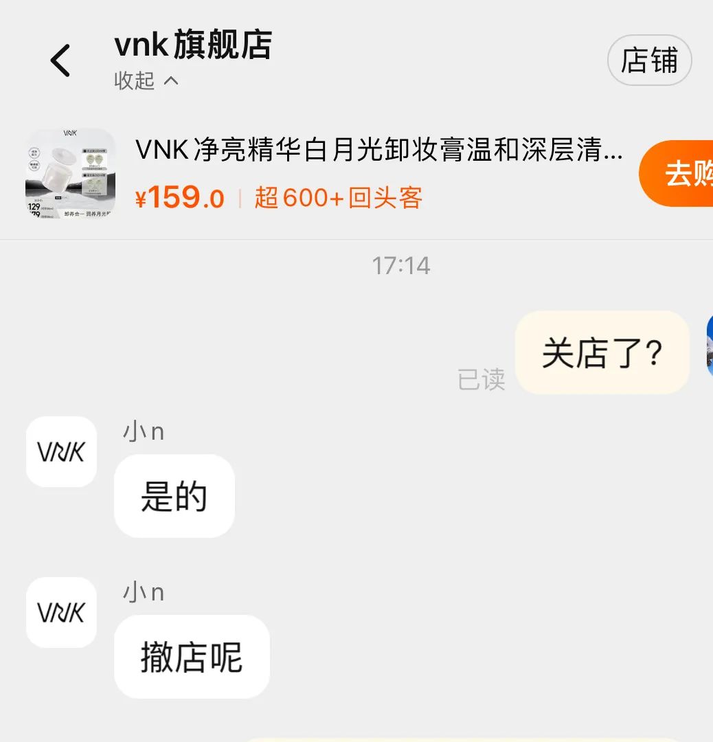 曾經被毛蛋、李佳琦們帶火的彩妝國貨品牌VNK,悄悄下架了天貓、抖音旗艦店商品,且頁面展示商品也已經無法購買,當被問及是否關店時,VNK天貓旗艦店客服回應《聯(lián)商網》稱“是的,撤店呢”。