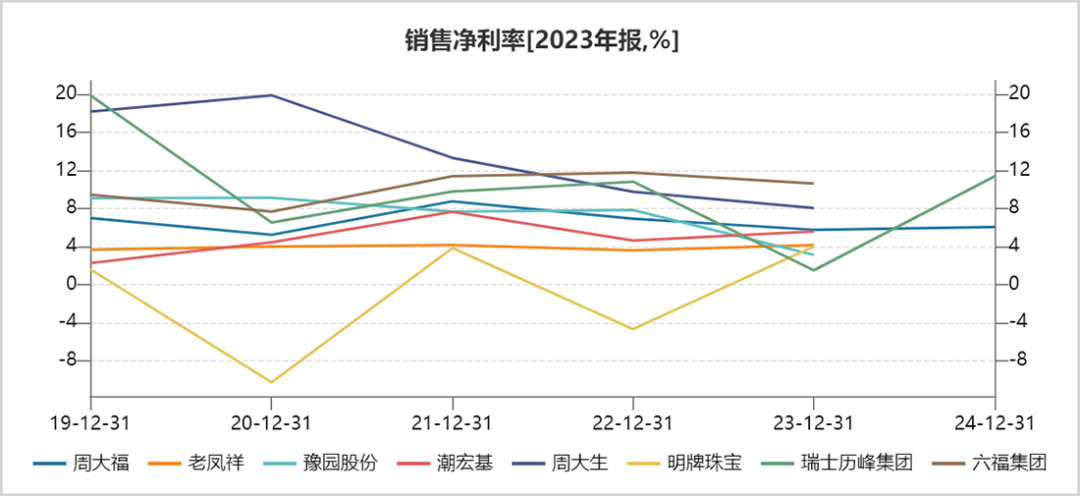 多家黃金珠寶商凈利率走勢圖;來源:Wind