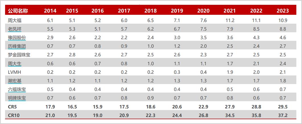 2018-2023年,市場TOP5占有率從18.6%持續(xù)攀升至29.5%。尤其是疫情三年,不少中小珠寶商倒閉,加劇了市場“大魚吃小魚”的現(xiàn)狀。