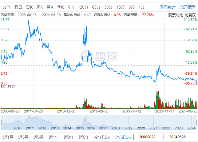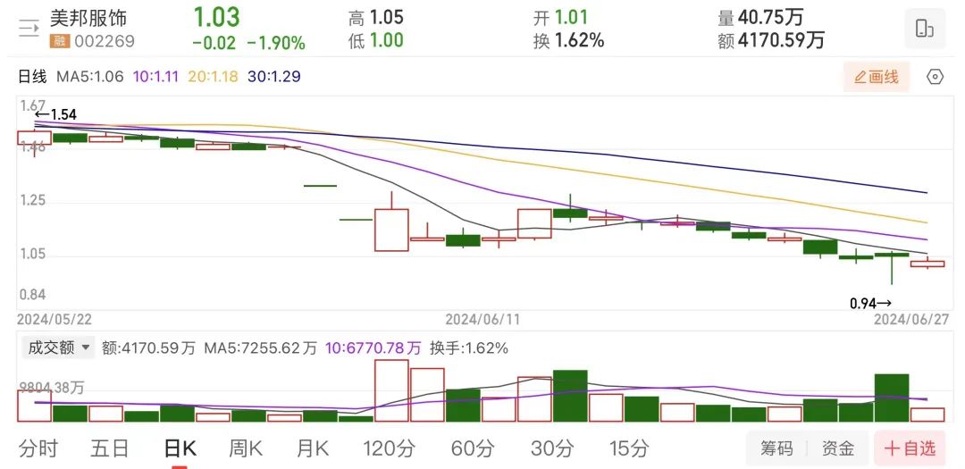 受此影響,6月以來,美邦服飾連續(xù)多個交易日下跌,股價一度下探至每股0.94元,逼近退市風險線。截至6月26日收盤,美邦服飾的市值已跌落至26.38億元,相比巔峰時期蒸發(fā)300多億元。