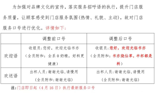 4月,書亦的品牌升級繼續(xù)推進(jìn),4月16日,書亦做出了口號變更通知,全員附和聲又回到「半杯都是料」。書亦部分城市開始不斷下調(diào)產(chǎn)品價格,并測試售價更低的產(chǎn)品,試圖找回「性價比」。