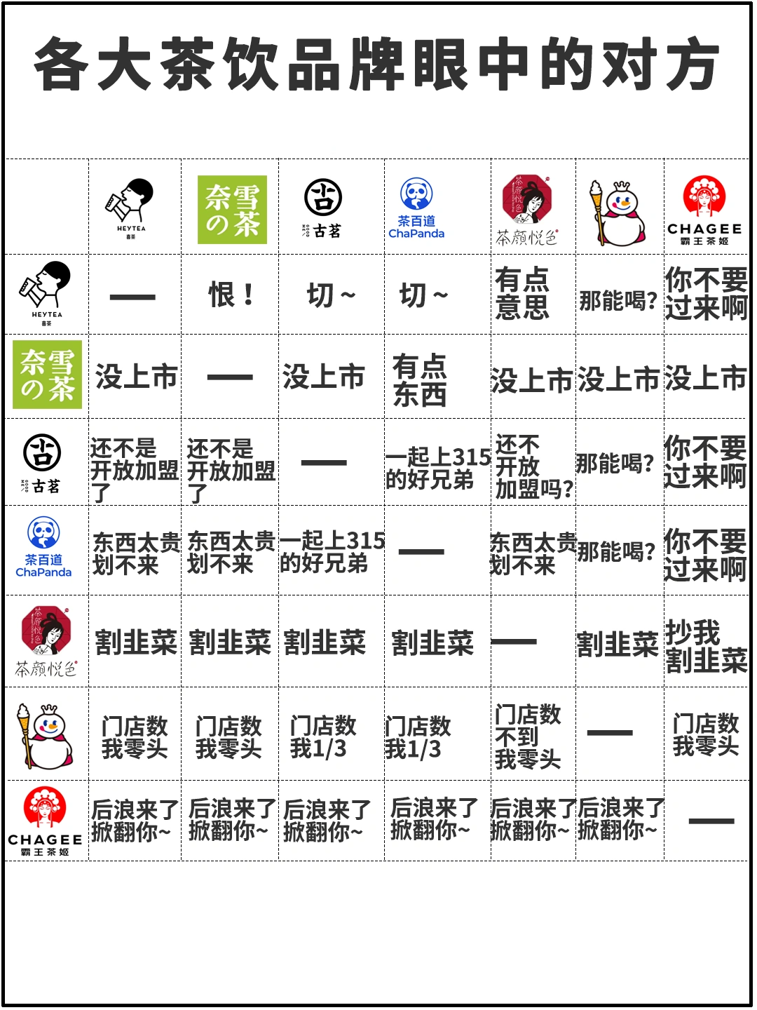 此前爆火的《各大茶飲品牌嚴(yán)重的對方》的梗圖,有喜茶、奈雪、古茗、茶百道、茶顏悅色、蜜雪冰城、霸王茶姬……卻沒有書亦的身影。
