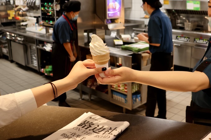 今年,逛國大的人會(huì)發(fā)現(xiàn)多了一個(gè)新產(chǎn)品,一張黑白分明、四四方方的報(bào)紙。路過的顧客抽走一張報(bào)紙,看完后撕下剪角,乘電梯到負(fù)二層,兌換一支麥記甜筒。