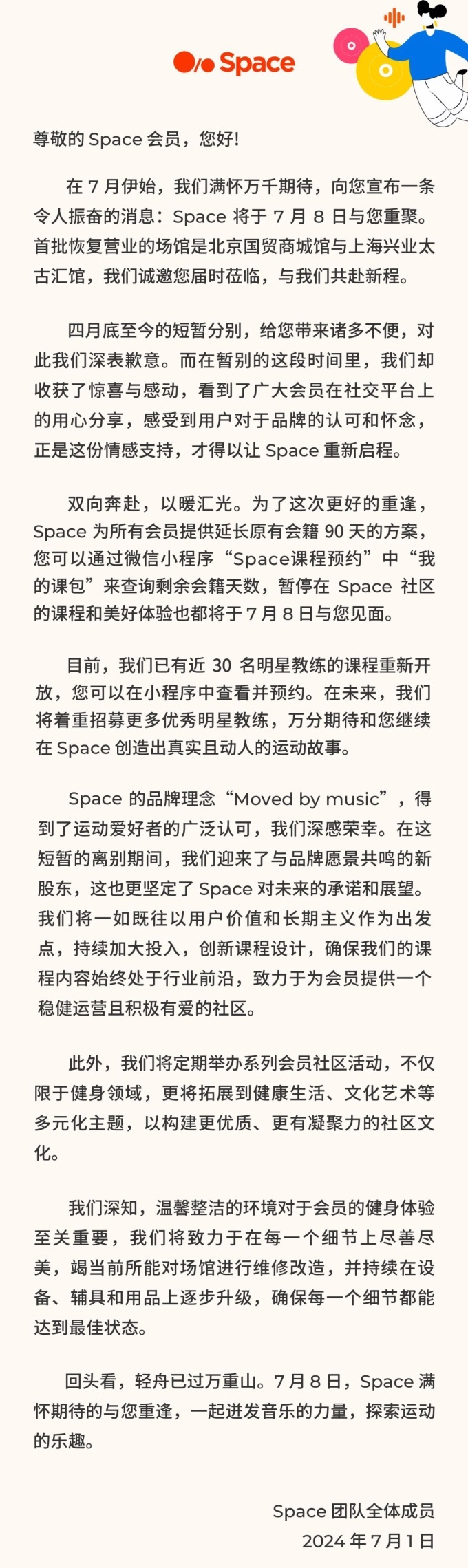Space官宣7月8日重新開業(yè),數(shù)月前被曝全國關(guān)店