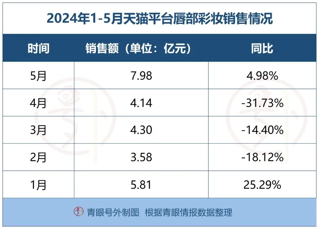 具體到銷售額來看,今年1-5月天貓平臺眼部彩妝銷售額為15.46億元,同比下滑47.02%;唇部彩妝銷售額為25.81億元,同比下滑33.98%。