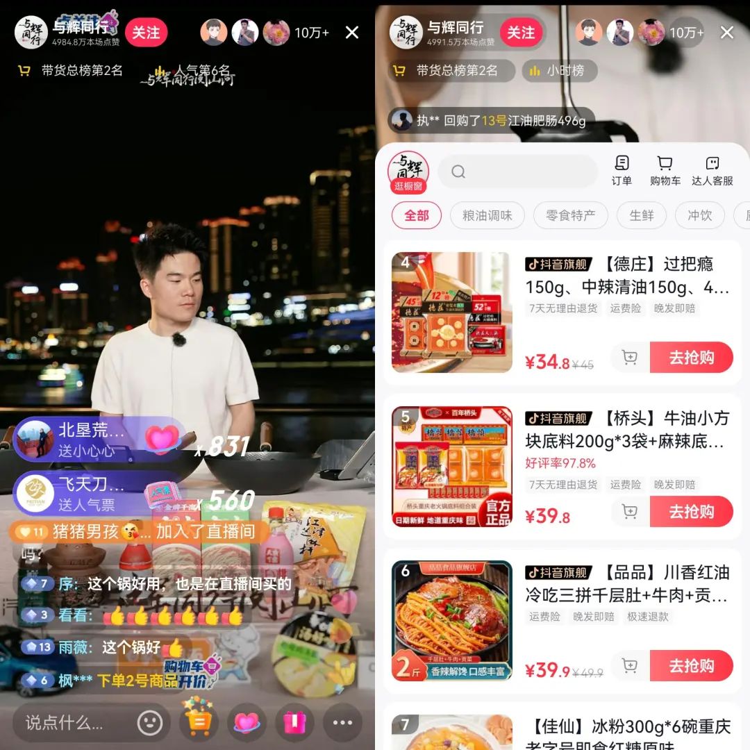 與輝同行和東方甄選,在某種程度上構(gòu)成了競爭關(guān)系:兩者主要帶貨的產(chǎn)品都是食品飲料和生鮮蔬果,略有不同的是與輝同行是導(dǎo)購式直播間,售賣著其他商家和品牌的產(chǎn)品,東方甄選帶貨的商品則以自營商品為主。