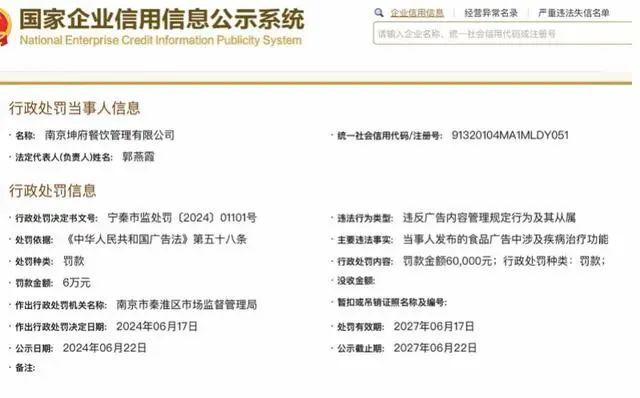 近日,國家企業(yè)信用信息公示系統(tǒng)顯示,和府撈面子公司南京坤府餐飲管理有限公司在發(fā)布的食品廣告中,涉及疾病治療功能,違反了廣告內(nèi)容管理規(guī)定,依據(jù)《廣告法》第58條規(guī)定,南京市秦淮區(qū)市場監(jiān)督管理局對該公司處罰款6萬元。