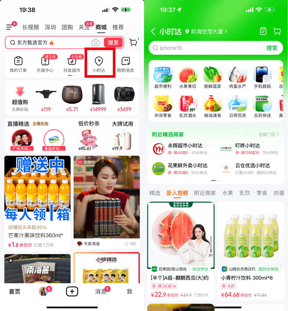 但是當(dāng)下,抖音即時(shí)零售已被視為抖音電商的核心項(xiàng)目。去年10月,抖音正式將“小時(shí)達(dá)”從“抖音超市”獨(dú)立出來,開設(shè)了單獨(dú)的入口,和抖音超市并列。用戶可以在抖音商城界面直接找到,或通過搜索“小時(shí)達(dá)”一鍵直達(dá)。而小時(shí)達(dá)的獨(dú)立入口,也能更進(jìn)一步促進(jìn)抖音電商GMV增長。