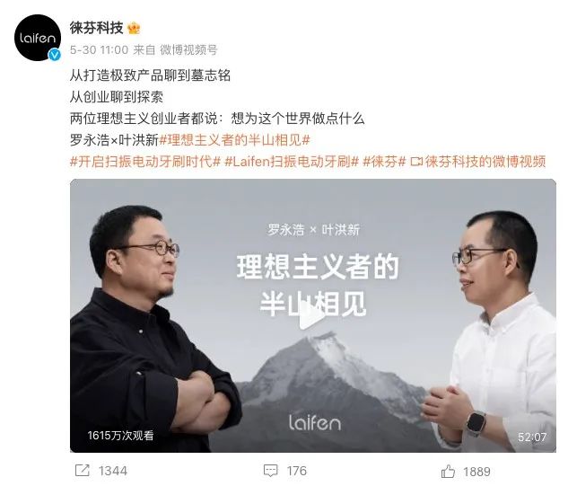 2024年5月30日,徠芬發(fā)布了公司創(chuàng)始人葉洪新和網(wǎng)紅羅永浩的對(duì)談視頻,重點(diǎn)討論了徠芬新推出的掃振電動(dòng)牙刷。隨后,徠芬又發(fā)布數(shù)張海報(bào),“感謝老羅的多次推薦”。