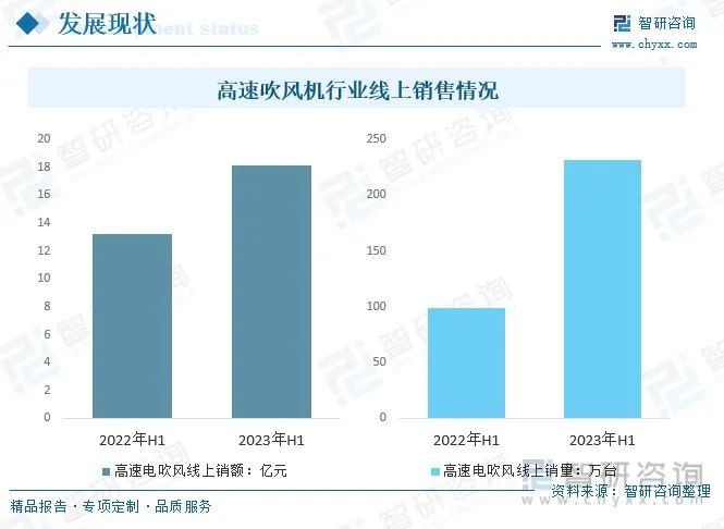 因高速吹風(fēng)機(jī)可以帶來(lái)差異化的使用體驗(yàn),該市場(chǎng)蓬勃發(fā)展。智研咨詢披露的數(shù)據(jù)顯示,2023年上半年,中國(guó)高速電吹風(fēng)線上銷售額18.1億元,同比增長(zhǎng)37%;線上銷量231.2萬(wàn)臺(tái),同比增長(zhǎng)134%。