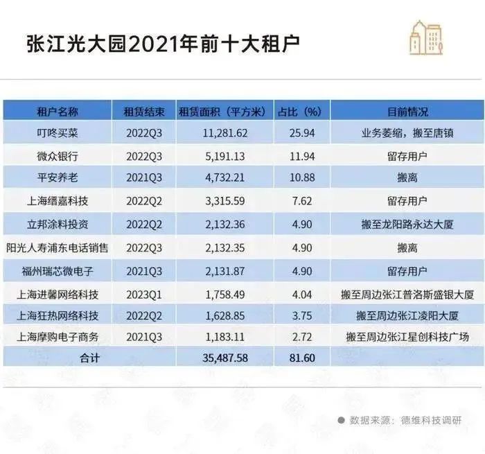 產(chǎn)業(yè)園REITS去年屢屢上新聞,年報里也不樂觀。建信中關(guān)村REIT的出租率急速下滑——從2022年初的96%一路跌至2023年底的64%;張江產(chǎn)業(yè)園REIT上市材料顯示,其公布的光大園2021年前十大租戶,現(xiàn)在還剩下的只有三家。