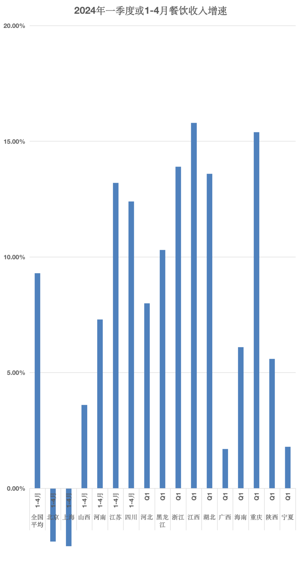 餐觀局盤點(diǎn)了16個省市一季度或1-4月的餐飲收入增長情況(由于未單獨(dú)披露餐飲數(shù)據(jù),如四川省、上海市為住宿和餐飲數(shù)據(jù)),發(fā)現(xiàn)京滬餐飲呈負(fù)增長,其他省市餐飲多呈現(xiàn)增長態(tài)勢。