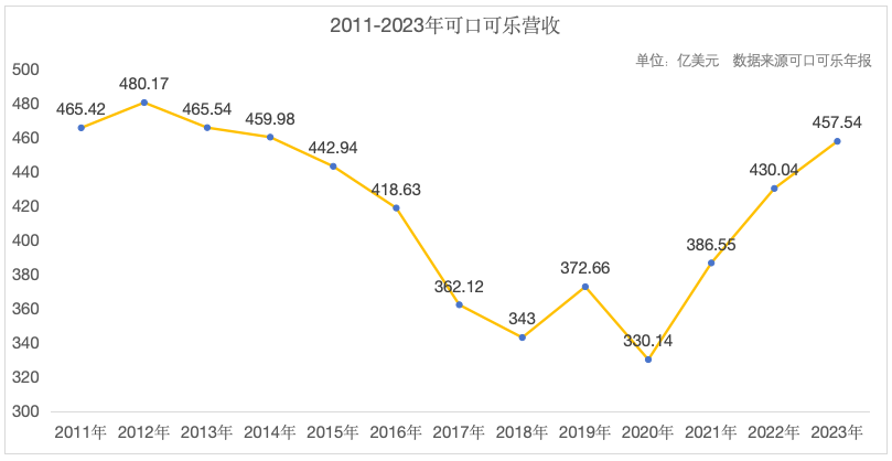 從2011-2023年的可口可樂營收數(shù)據(jù)來看,可口可樂的營收確實有所波動,2021年年底,可口可樂進行了官宣調(diào)價,經(jīng)典瓶裝可樂由3元漲至3.5元一瓶,2022年營收攀升。