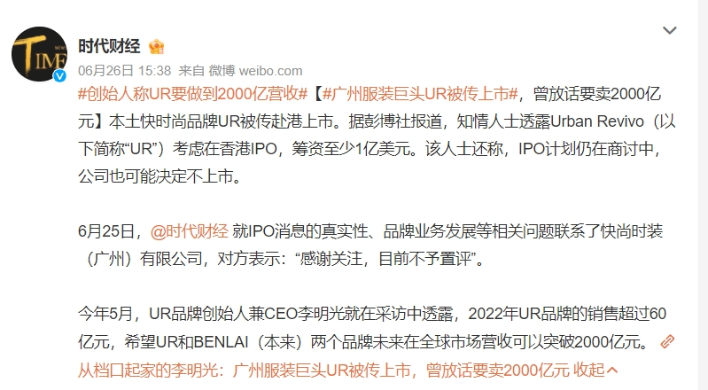 近日,媒體報道有知情人士透露稱,快時尚品牌URBAN REVIVO(以下簡稱“UR”)正考慮赴港上市,籌集資金至少1億美元(約合人民幣7億元);該人士還稱,IPO計劃仍在商討中,公司也可能決定不上市。