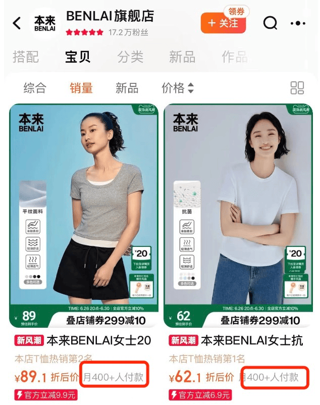 不過,從BENLAI本來天貓旗艦店業(yè)績來看,銷量并不算理想,兩款熱銷T恤月銷售量僅為400 件。