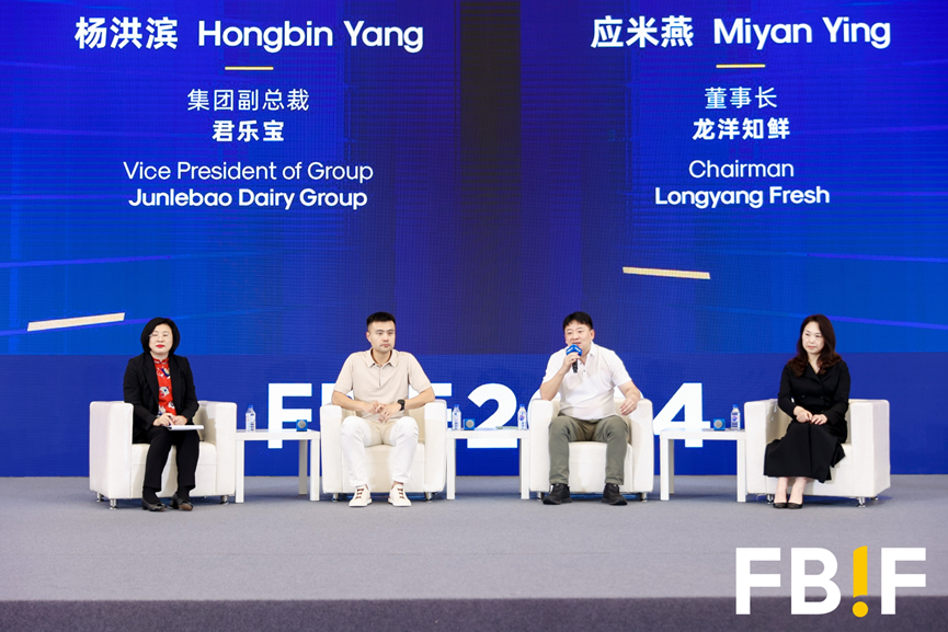 從左至右分別為:貝恩公司全球?qū)<液匣锶唆斝悱、君樂寶集團(tuán)副總裁楊洪濱、方家鋪?zhàn)覥EO方敏、龍洋知鮮董事長應(yīng)米燕