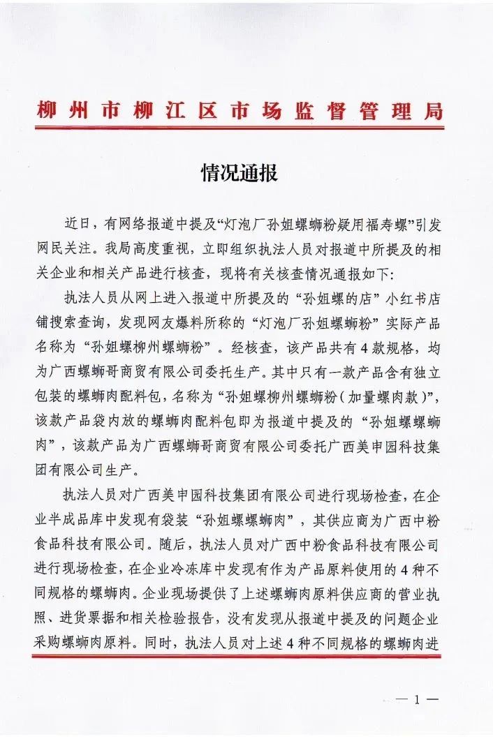 7月4日凌晨,廣西柳洲市柳江區(qū)市場監(jiān)督管理局就此事發(fā)布情況通報:執(zhí)法人員從網(wǎng)上進(jìn)入報道中所提及的“孫姐螺的店”小紅書店鋪搜索查詢,發(fā)現(xiàn)網(wǎng)友爆料所稱的“燈泡廠孫姐螺螄粉”實際產(chǎn)品名稱為“孫姐螺柳州螺螄粉”。