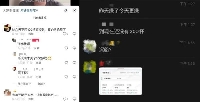 這位聯(lián)營商還不是庫迪旺季杯量慘淡的唯一“受害者”,在這條視頻的評論區(qū),就有同為庫迪聯(lián)營商的人吐槽,這幾天下雨連100杯都沒賣到,同時表示“真的快絕望了”。還有不止一位聯(lián)營商在內部群里曬出的“不足200杯”“訂單量20”等并不樂觀的日杯量。