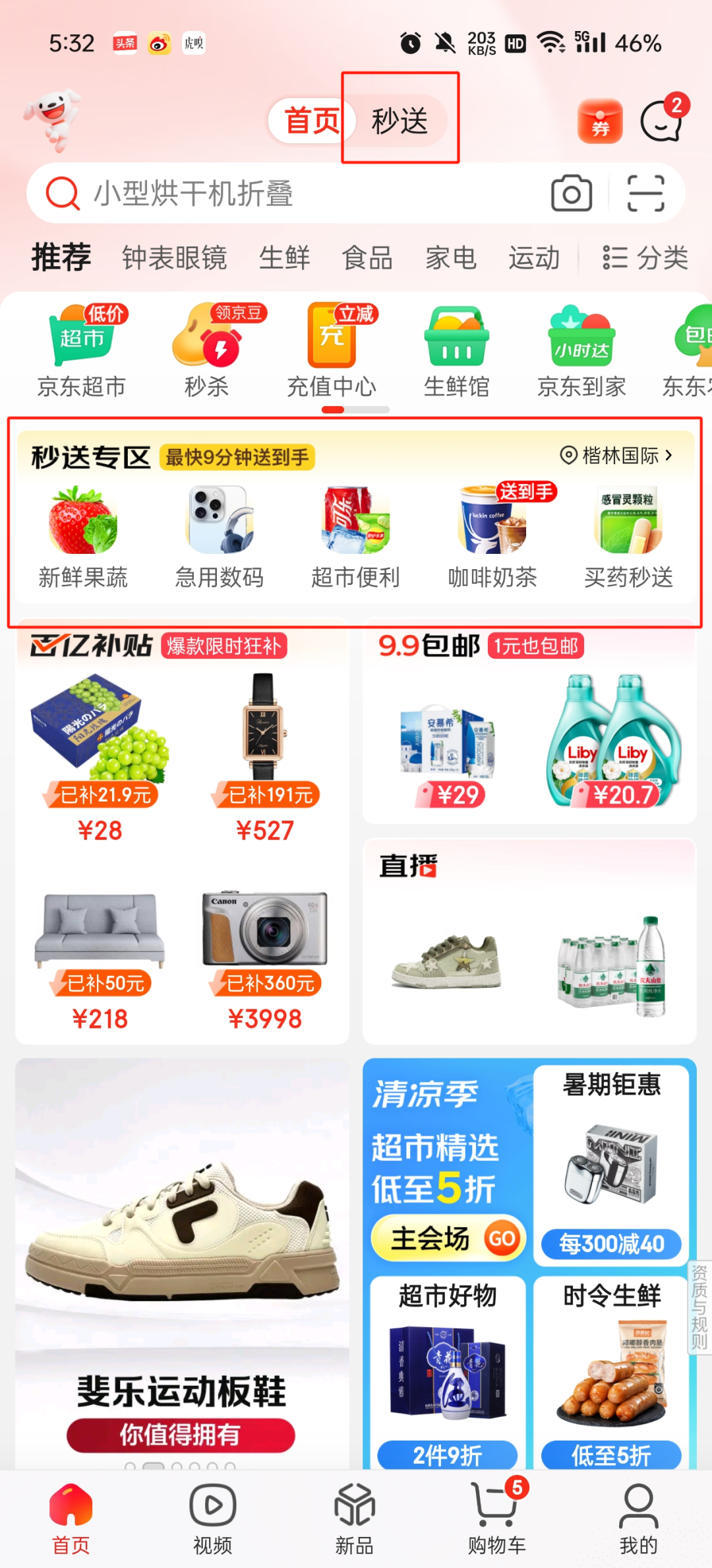 520前夕,京東整合原即時(shí)零售品牌京東小時(shí)達(dá)、京東到家,統(tǒng)一升級(jí)為 “京東秒送”,提供最快9分鐘送達(dá)的購(gòu)物體驗(yàn)。在京東APP里,“秒送”與“首頁(yè)”并列入口,同時(shí)又新增首頁(yè)關(guān)鍵位置“秒送專(zhuān)區(qū)”,處于APP一級(jí)入口。