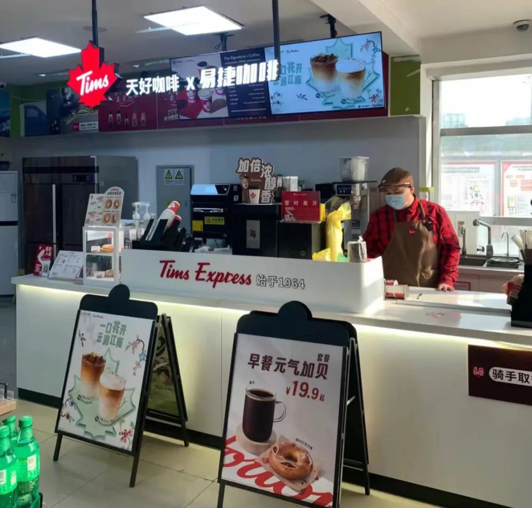 例如,庫迪推出便捷店型“COTTI Express”,但它并不是第一家瞄準便利店的咖啡品牌。連鎖咖啡品牌Tims在去年5月已和中石化的易捷便利店“喜結連理”,開出了“易捷×Tims Express”融合店,占地面積僅為20平方米左右。