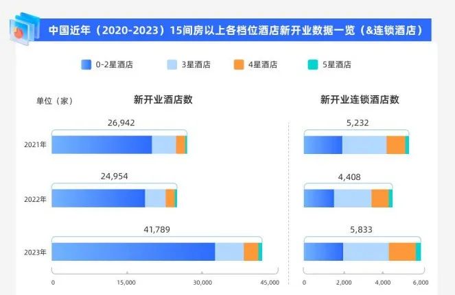 也因此,連鎖酒店們開新店的步伐也加快了。酒店之家驛鏡數據研究院發(fā)布的《2024中國酒店投資白皮書》顯示,2021~2023年,酒店新開業(yè)數量呈現出“先降低,再升高”的趨勢,特別是2023年,無論是新開業(yè)酒店數,還是新開業(yè)連鎖酒店數,均躍升至一個“新量級”。