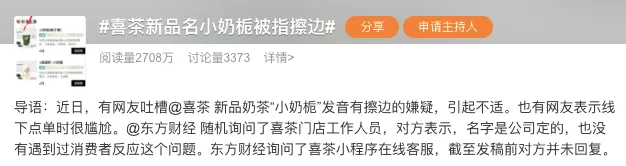 #喜茶新品名小奶梔被指擦邊#的話題也迅速登上熱搜,引起廣泛討論。