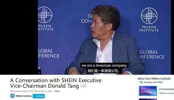 這被業(yè)界視作 Shein 赴美上市遇阻后,對(duì)美國的言語示好。不過很快,米爾肯研究所就已經(jīng)從網(wǎng)站上刪除了唐偉的這段視頻,同時(shí),據(jù)《金融時(shí)報(bào)》報(bào)道,兩位商業(yè)專欄作家表示,Shein 曾敦促他們不要報(bào)道唐偉的這段演講。