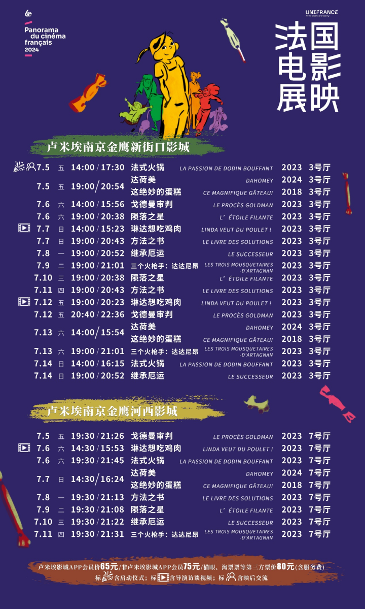 7月5日至7月14日期間,在盧米埃影城南京金鷹新街口店及南京金鷹河西店,將展映9部法國電影,分別是《法式火鍋》、《戈德曼審判》、《隕落之星》、《琳達想吃雞肉!》、《方法之書》、《繼承厄運》、《三個火槍手:達達尼昂》、《達荷美》、《這絕妙的蛋糕!》。