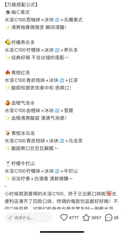 要DIY出各種不同口味的飲料,飲料才是“錦上添花”的那匹“錦緞”。比如水溶C100酸酸甜甜的口味幾乎讓它成為了“萬能調(diào)飲品”,這篇用水溶C100搭配的筆記也收獲了超過4000個贊。