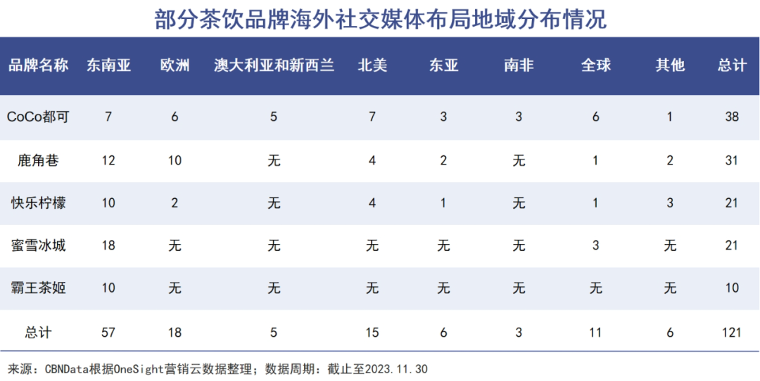 OneSight營銷云數(shù)據(jù)顯示,東南亞是目前茶飲品牌出海的首選。根據(jù)茶飲品牌社交媒體的布局看,CoCo、鹿角巷、蜜雪冰城、霸王茶姬等品牌都將東南亞作為出海重鎮(zhèn),其次是歐洲和北美,除此之外,中東也成為部分茶飲品牌出海掘金的新目的地。